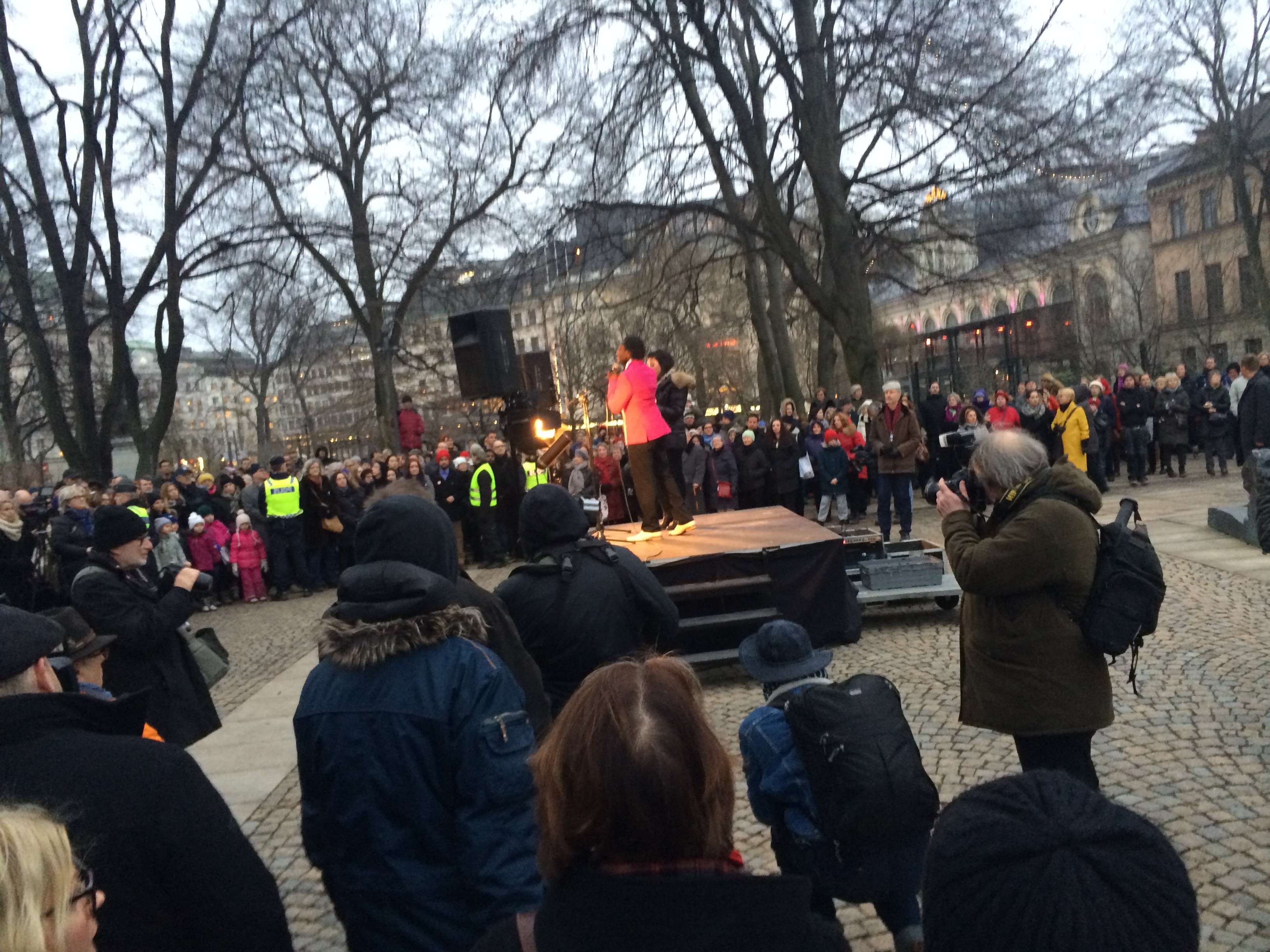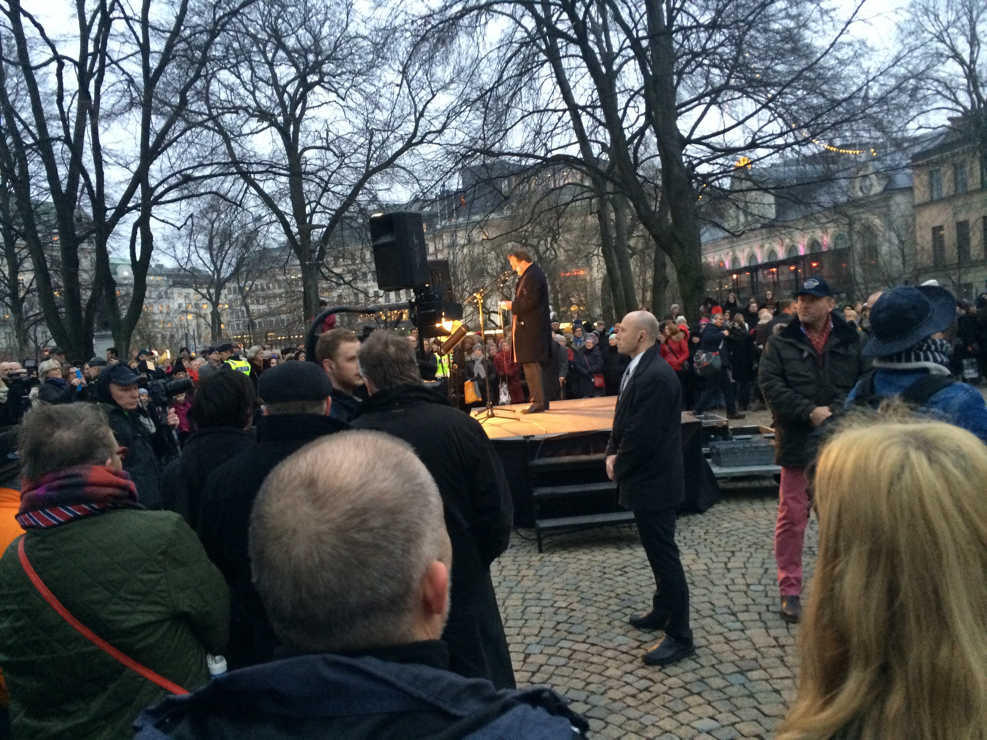 Var med idag på manifestationen mot antisemitismen vid Stockholms synagoga. Vi bildade en lång kedja där vi stod hand i hand runt synagogan i vår protest mot antisemitismen. Några av initiativtagarna var unga muslimer. Statsminister Stefan Löfven höll ett utmärkt tal, man ser Löfven på ena bilden. Fick möjlighet att växla några ord med statsministern och tackade för talet.